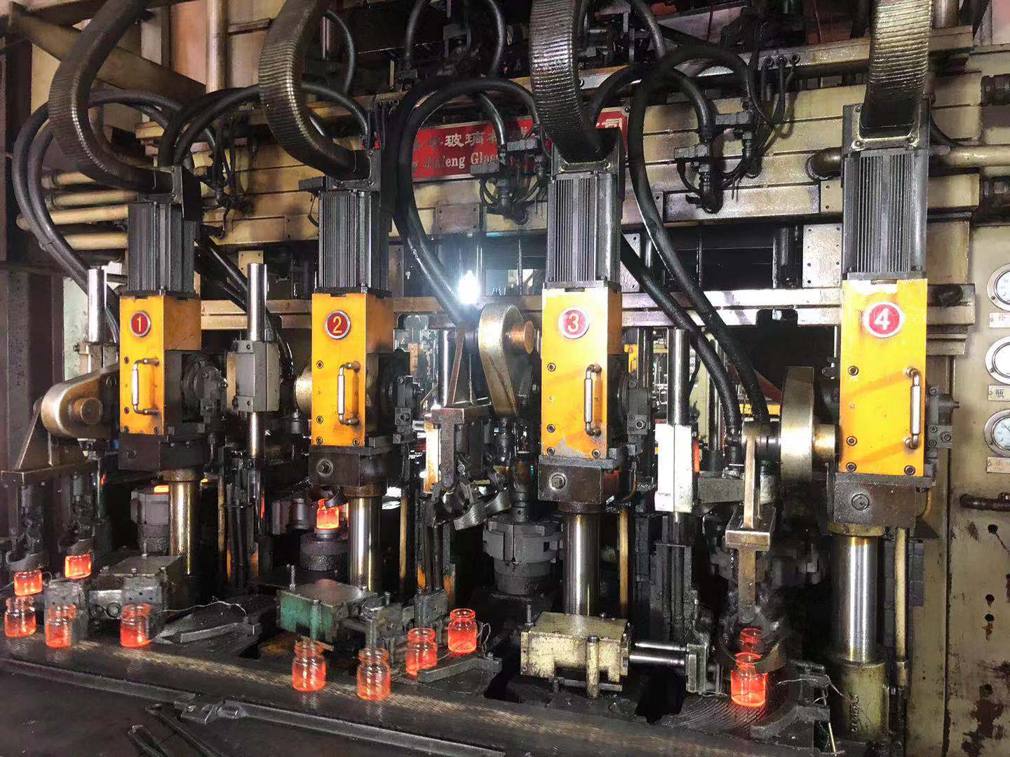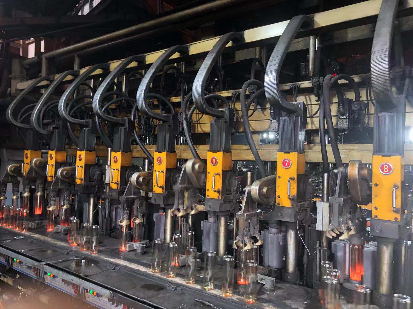 生產設備共4臺行列機,兩臺十組單滴(HD10)全伺服行列式制瓶機,伺服剪切,伺服方料,適 應于高級速,生產各種廣口瓶、異性瓶、啤酒瓶等,產品質量穩定,每臺機日產量在12萬只左右。